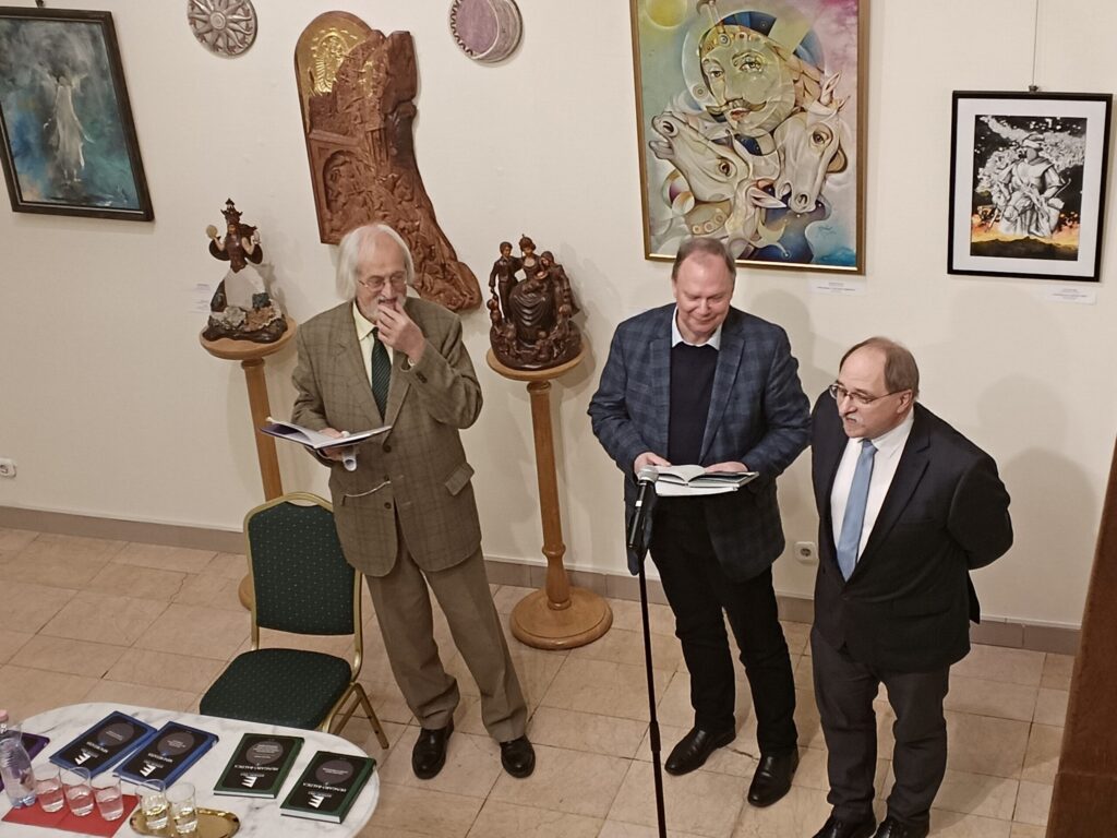 Krājuma atvēršana 27. novembrī Budapeštā. No kreisās atdzejotājs Jānošs Pustai, Karls Pajusalu un Budapeštas Universitātes Somugru katedras vadītājs Andrāšs Berecki (Bereczki András), kurš dzejnieka vārdus tulkoja ungāriski. Foto: Oršoja Silda (Sild Orsolya)