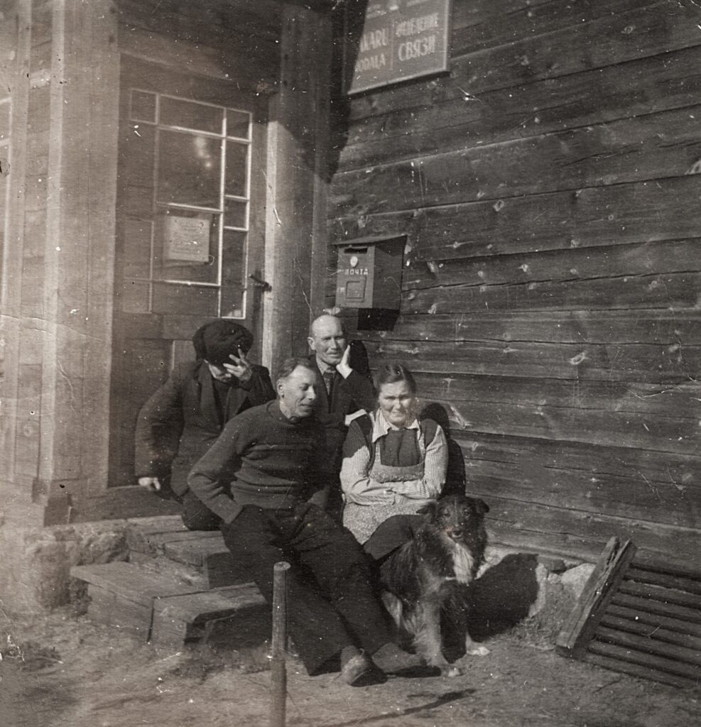 Ķeļķos padomju laikos bija ciema sakaru nodaļa. Aizmugurē no labās Pēteris Dambergs un Kārlis Dambergs, priekšā Vilma Silanagla ar dzīvesbiedru Miķeli. 1950. gadi. Foto: Baibas Dambergas albums