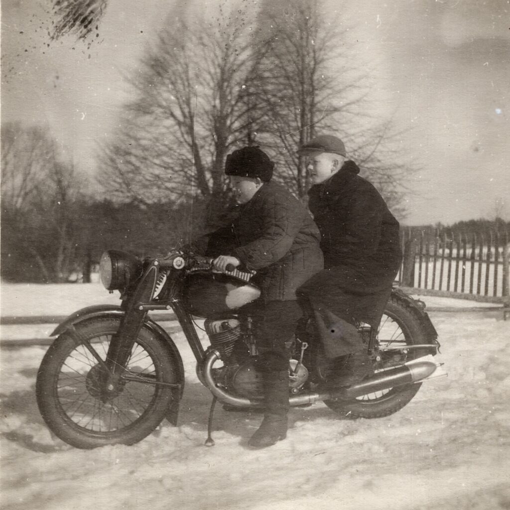 Puiši uz motocikla. Sīkrags, 1950. gadi. Foto: Baibas Dambergas albums