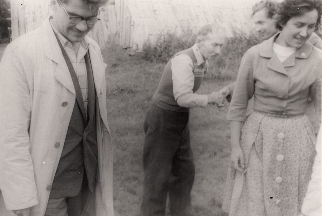 Igauņu valodnieks Mati Hints (no kreisās) atvedis lībiešu interesentus pie Kārļa Damberga (vidū). Sīkraga Ķeļķi, 1962. gads. Foto: Baibas Dambergas albums